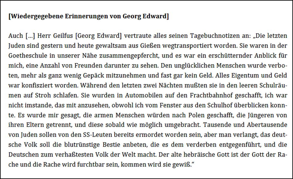 Der Gießener Schriftsteller berichtete darüber wie die Bewohner*innen der sog. Judenhäuser (insgesamt gab es in Gießen ca. 8 oder 9, drei davon wurden im 2. Weltkrieg zerstört) [10] aggressiv und brutal in die Sammelstelle verbracht wurden. Sammelstelle für die Deportation war die Goetheschule.
